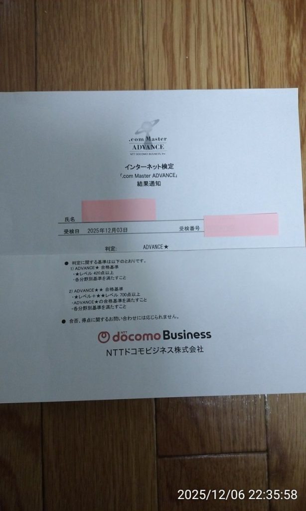 .comマスターADVANCE 受検しました。